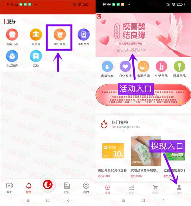 这个活动跟昨天今日高邮的活动一样,通过下载“我的广德”A[PP我的广德APP,点底部“服务”再点“积分商城”再点横幅“摸喜鹊结良缘”进去,小游戏分数达到120分抽奖,刚中0.66元,中到红包在积分商城页面点右下角“我的”进去记录里提现到支付宝秒到,非必中。