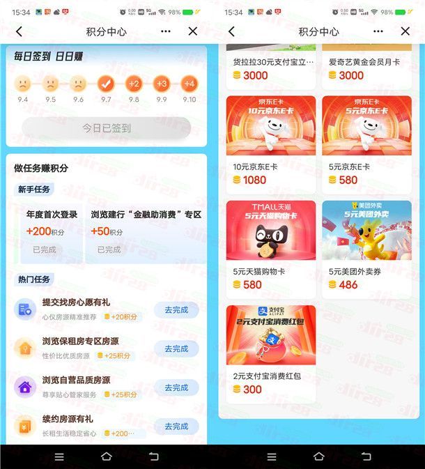 这是建行建融家园的一个积分兑换活动,通过打开中国建设银行APP搜索【建融家园】进去,在我的页面点积分进去,登陆会送200个积分,完成新手任务和热门任务里的简单浏览任务,只要累计积分达到300个就可以兑换2元支付宝红包,兑换后目前秒到。