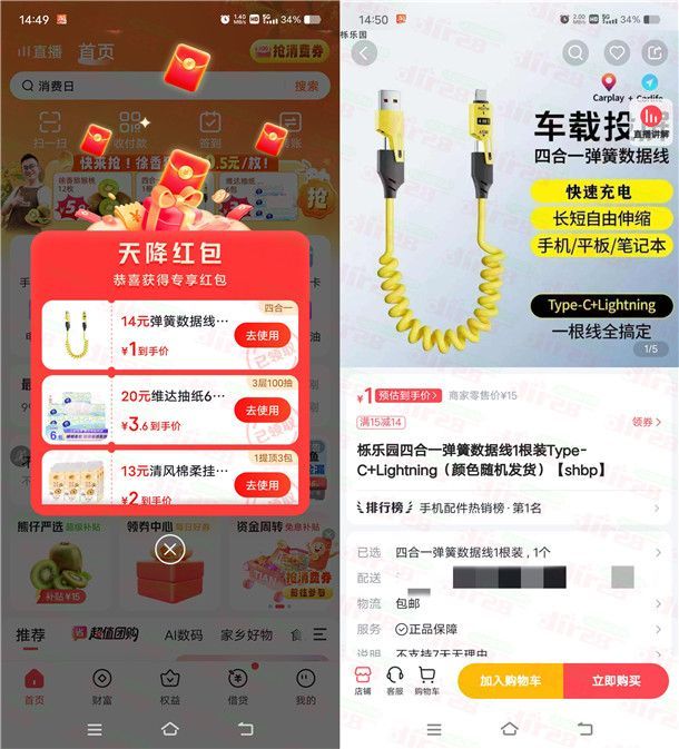 这是翼支付APP的一个简单领券活动,通过打开“翼支付”APP,首页会自动弹窗14元券(如果没有弹窗就参加不了),然后再去购买页面提示的四合一数据线,用券抵扣后1元购买包邮,需要数据线的可以去领取参加。