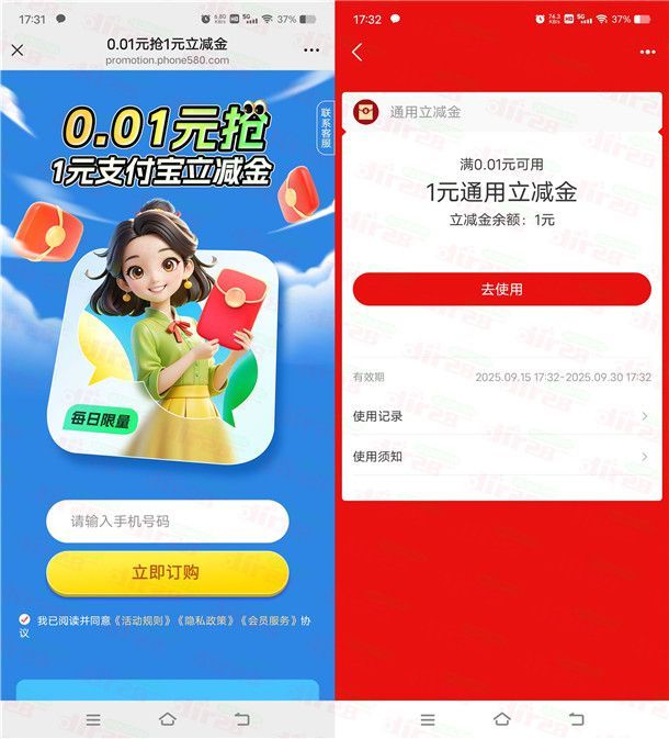 活动地址:手机打开:https://promotion.phone580.com/activity/jdzf-1y