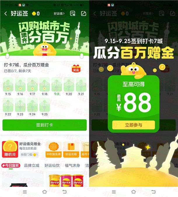 参加天猫超市举办的集齐闪购城市卡分百万活动,通过打开“淘宝”APP,首页点【天猫超市】进去,点搜索框搜索【好运签】参加,累计签到7天瓜分百万天猫超市卡,瓜分到的天猫超市卡可以在淘宝购买天猫超市商品无门槛叠加抵扣使用。