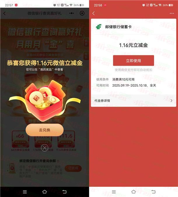 邮储银行微信查询赢好礼抽1.16-66元微信立减金 亲测中1.16元