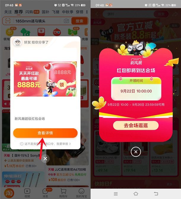 参加淘宝举办的新风潮天天开红包必得最高8888元无门槛红包活动,通过打开淘宝进去活动里,每天点击弹窗都可以抽奖1次,必中最高8888元淘宝无门槛红包,在红包首发当日、以及加码日还有概率中到大包,累积得到的红包可以在9月22日-9月26日跟所有淘宝红包一起叠加抵扣。
