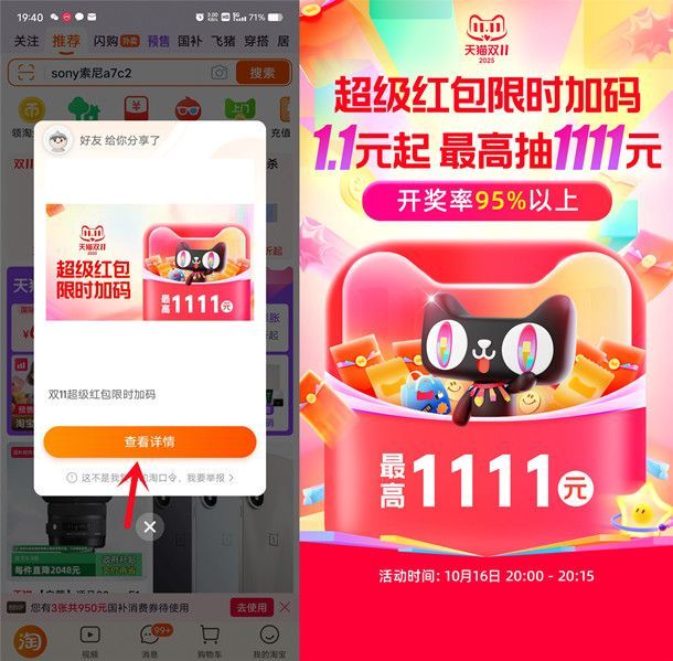 必中 今晚20点淘宝双11超级红包加码 必中1.1元以上红包
