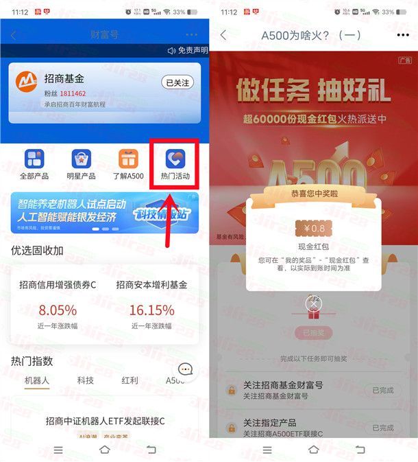 参加工行举办的招生基金简单任务抽6万份现金红包活动,通过打开“中国工商银行”APP搜索【招商基金】下拉进去场景号里,点【热门活动】进去点【A5为啥火】完成2个简单的关注任务抽,有机会中到0.8元现金红包,中到的现金红包秒到工行卡余额里,共6万份。