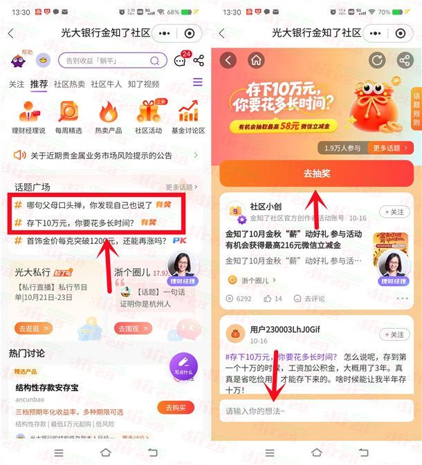 小编提示:打开“光大银行”APP搜索【金知了小店】进去,点击话题广场的2个显示有奖的话题进去,点底部随便评论一下就可以看到抽奖入口,刚中1元,非必中