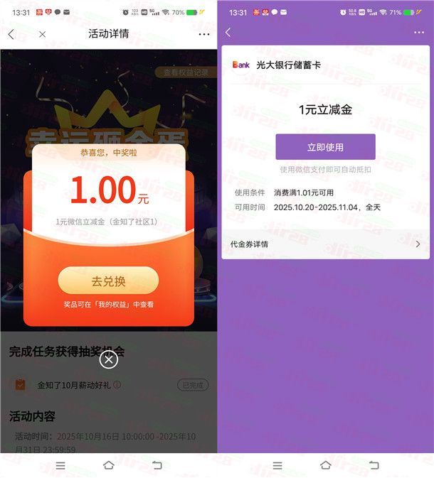 光大银行金知了社区简单评论抽1-88元微信立减金 亲测中1元