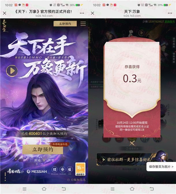 参加网易天下万象举办的游戏预约抽最高888元红包活动,通过打开微信进去活动里,进去登陆预约后可以抽奖1次,有机会中到0.3-888元微信红包,小编测试中到0.3元红包,红包需要在10月24日12:00之后提现。