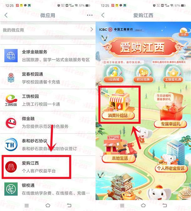 小编提示:需要江西工行才可以,打开“中国工商银行”APP搜索【微应用】点【爱购江西】进去,点【消费补给站】根据借记卡、和信用卡可以领3-88元微信立减金,别领错了,刚中5元