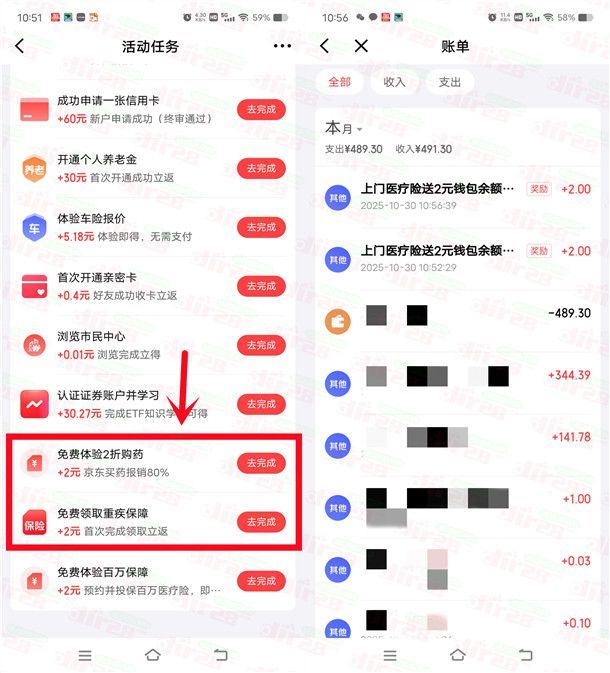 京东金融的2个简单的领现金红包的任务,通过打开“京东金融”APP,在【我的】页面点【余额】进去,在天天赚现金那里点查看更多,下拉到底点【免费体验2折购药】和【免费领取重疾保障】这2个任务进去免费领取,就可以得到4元现金红包(需要手动领,如果领取失败就重新领或者过一会再去领),然后再去退保刚刚购买的2份保险,后续就不会扣费了。