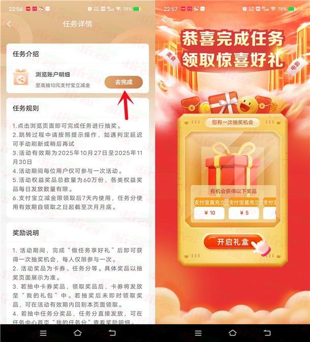 参加建行举办的浏览账户明细抽最高10元支付宝红包活动,通过打开“支付宝”APP搜索【中国建设银行】进去服务页面,点【做任务抽好礼】跳转到“中国建设银行”APP活动里,完成一个简单的浏览任务抽奖,有机会中到1-10元支付宝红包,非必中。
