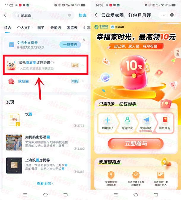 参加移动云盘举办的幸福家时光最高领10元红包活动,这个活动全国三网手机号码都可以去,通过打开“中国移动云盘”APP搜索【家庭圈】进去,随便创建一个家庭圈,创建后进去家庭圈点滚动横幅完成“创建+发布一条动态+邀请1个好友”就可以领到2元支付宝红包,发布第一条动态也可以领2元(现在领完了,不知道后面会不会补),数量限量。