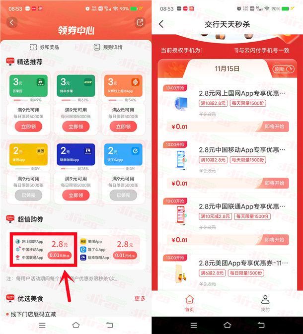 参加交通银行举办的秒杀狂欢季天天秒杀活动,通过打开“交通银行”APP搜索【领券中心升级版】进去,每天10点0.01元秒杀2.8元网上国网优惠券、2.8元中国移动/联通优惠券,可以充10元电费、话费使用,每天限量。