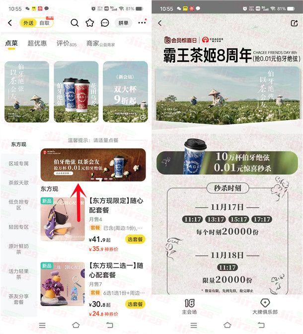 2、打开“美团”APP搜索【霸王茶姬】随便进去一家店铺,点滚动横幅【10万杯伯牙绝弦0.01元惊喜秒杀】进去,11:17、13:17、15:17、17:17每个点2万名,共8万名