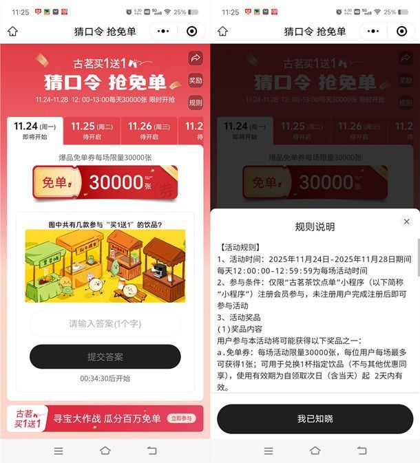 参加古茗举办的猜口令抢15万份奶茶免单活动,通过打开微信进去古茗小程序活动里,每天中午12:00整开始,填写当天的口令答案每天抢3万份奶茶免单,活动持续5天,共送出15万份奶茶免单,这个活动需要整点去,每天数量限量。