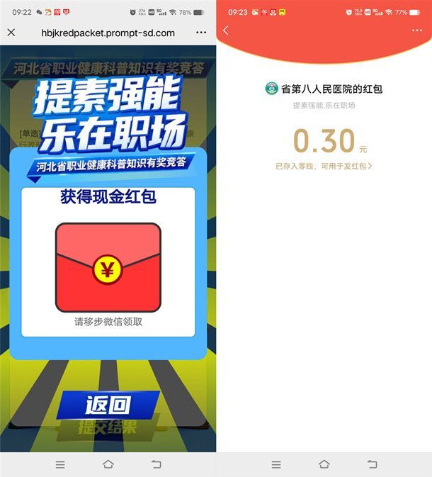 河北职业健康科普答题抽0.3-3元微信红包 亲测中0.3元秒推