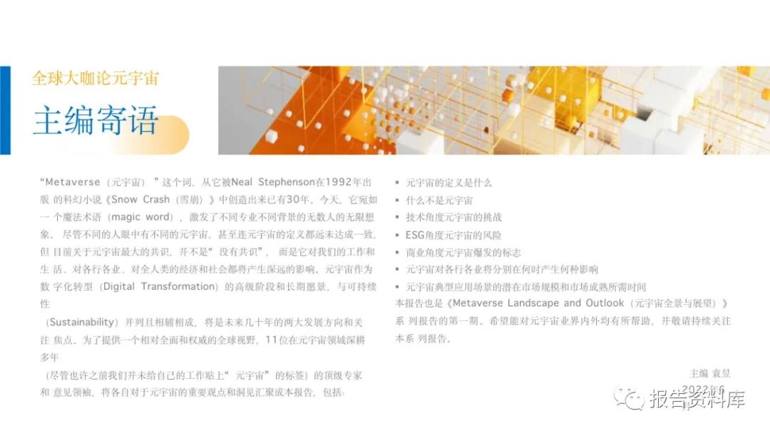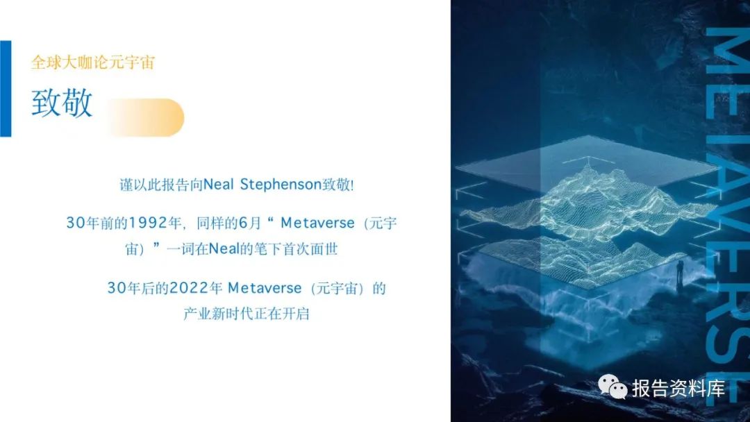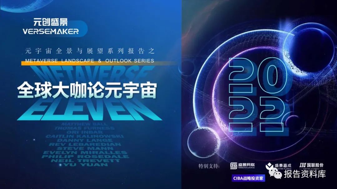 元创盛景: 《元宇宙全景与展望系列报告之全球大咖论元宇宙》 (完整版.pdf ) 以下仅展示部分内容 O后台回复“20220706”就可以获取《元宇宙全景与展望系列报告之全球大咖论元宇宙》(完整版) 的全文下载链接。