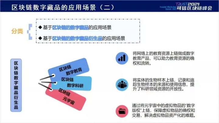 第二类是衍生区块链数字馆藏的应用场景,即数字馆藏在数字保险、数字教育、数字科研、元界场景等新领域的使用衍生的场景。