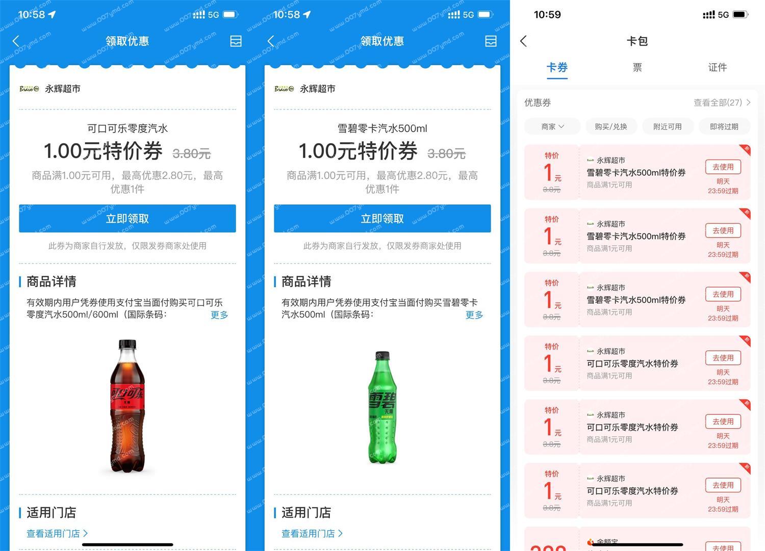 支付宝APP扫码->可乐券和雪碧券可各领取3张->附近有永辉超市的上吧!