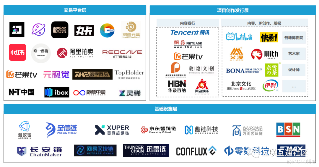 国内数字收藏交易平台层与底层基础设施深度绑定。凭借自主研发联盟链的技术实力、行业权威和平台流量优势,基于互联网巨头的交易平台成为“头号玩家”,占据了大部分市场份额;其次,拥有成熟联盟链数字收藏解决方案和优质创作者内容和IP的腰部平台层出不穷;