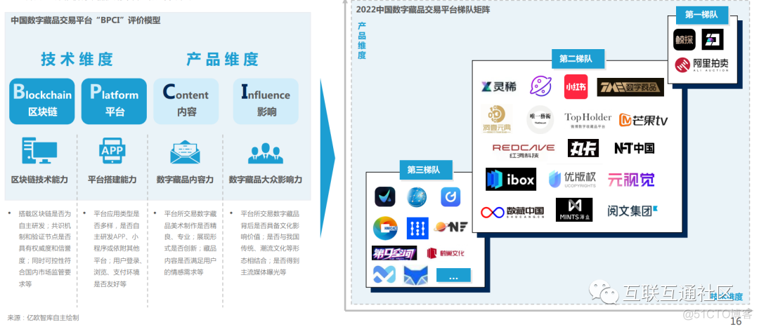 据不完全统计,目前国内数字收藏交易平台已达100多家数字藏品行业分析,新平台层出不穷。作为参考,亿欧智库建立了中国数字馆藏交易平台“BPCI”评价模型;评价体系由技术和产品两个维度构成,遵循指标的代表性、稳定性、变化的协调性和敏感性以及数据的可用性。基于自然等原则,建立了区块链技术能力、平台建设能力、数字馆藏内容力、数字馆藏公众影响力四个二级指标。亿欧智库经过行业专家调研、访谈和数据整理数字藏品行业分析,结合问卷调查收集的第一手数据,保证了评价体系的客观性和可靠性,从而对我国数字化收藏交易平台进行矩阵划分.