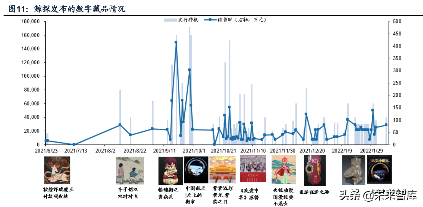 Whale Scout 是目前我国最大的数字馆藏交易市场。 2021年6月23日至2022年1月31日,Whale Scout共发布255个数字合集,限量302万份,售价在1.11-39元/份,对应The总销售额达4623万元。在这个阶段,WhaleTrack 不允许买家转售他们购买的数字馆藏。购买180天后才能转让,收货2年后可再次转让。 WhaleTalk 销售的数字收藏包括支付代码皮肤、数字图片、音频、视频和数字 3D 模型。创作者主要是艺术家、知名IP、博物馆等优质内容方。经草根调研,WhaleTalk发布的数字馆藏需求主要来自:(1)数字馆藏的保值/增值预期;(2)文创/潮玩的馆藏需求)产品;(3)相关IP粉丝效应。基于支付宝庞大的用户群和WhaleTalk现阶段提供的限量低价数字馆藏,WhaleTrack发布的数字馆藏基本可以在一分钟内售罄.