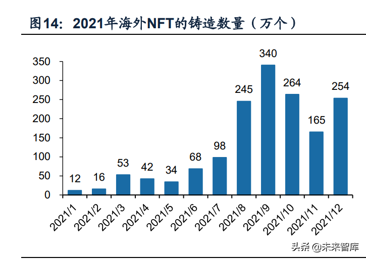 与国内市场不同,海外NFT市场的发展阶段更为成熟。以OpenSea为首的NFT交易平台,支持用户一键铸造和发布自己的NFT项目,同时提供了较为完善的NFT二级交易市场。因此,海外NFT市场供大于求,大部分交易份额集中在少数几个NFT项目上。据 PANews 报道,2021 年新铸造的 NFT 数量将达到 1591.260,000,平均每月铸造 132.600,000 NFT,其中 340.43 在九月高峰 千人。根据 NFTGO 的追踪数据,价格为 0-0.1 ETH 的 NFT(以太坊)有 226 万个,价格为 0.11-1 ETH 的 NFT(以太坊)有 254 万个. 1.01-10 ETH NFT (Ethereum) 有 490,000,价格是 10.01-100 ETH NFT (Ethereum) 有 3. 150,000,价格是 100 ETH 只有 2120 NFT ( Ethereum) 上面,剩下的大量 NFT 还没有卖出去。