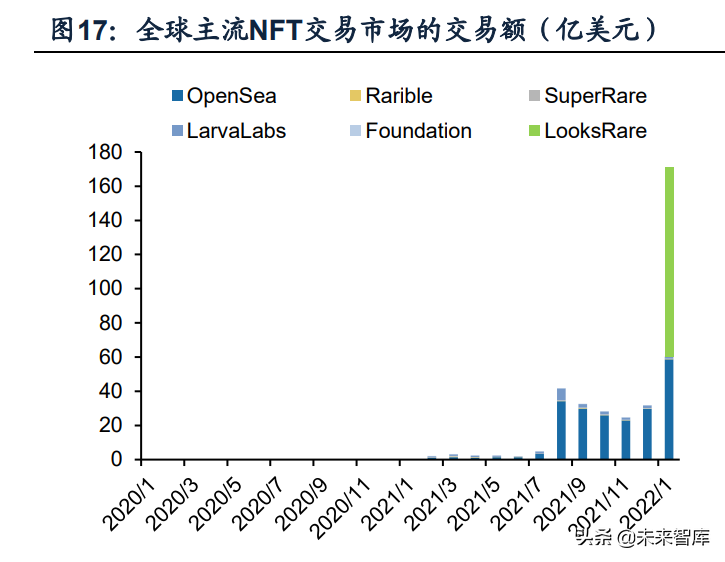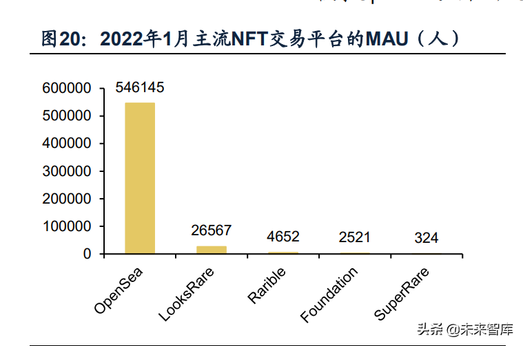 从活跃交易用户来看,OpenSea的规模优势依然显着。根据 Dune Analytics,2022 年 1 月 OpenSea 的活跃交易用户数为 54.610,000数字藏品行业分析,大大领先于 LooksRare 的 2.660,000、Rarible 的 0.470,000、Foundation 的 0.@ >250,000 人。海外 NFT 市场交易量与交易用户份额的错位是因为 LooksRare 的交易量主要来自洗售交易,其实际活跃交易用户远低于 OpenSea。因此,OpenSea 在海外 NFT 交易市场仍具有显着的规模优势。