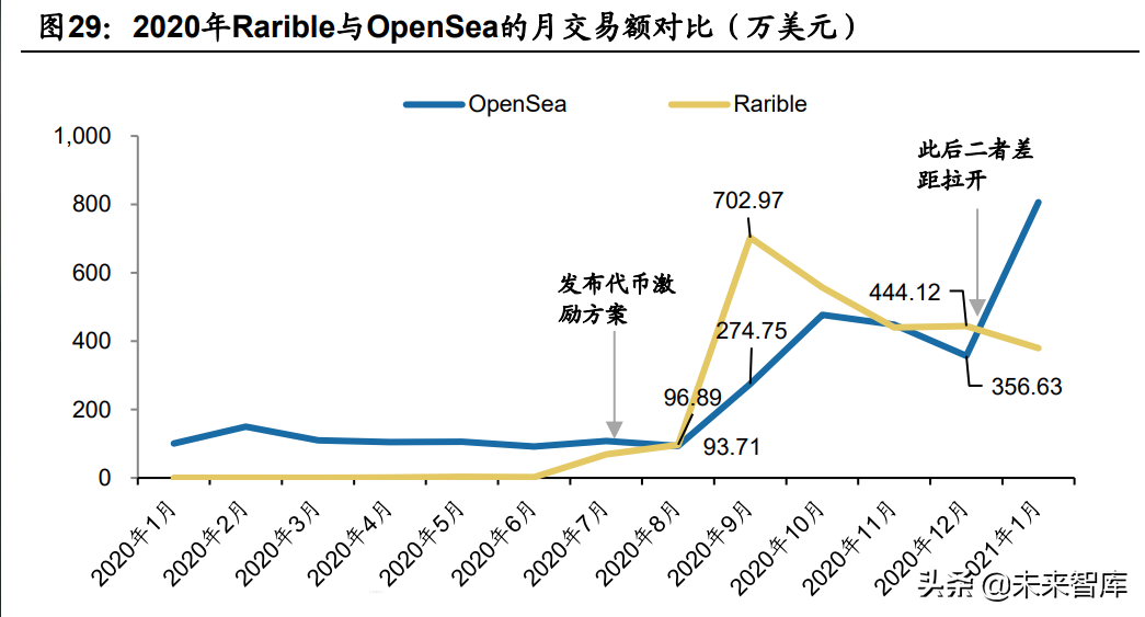 以 Rarible 和 OpenSea 的演变为例。作为第一代去中心化 NFT 交易平台,Rarible 于 2020 年 7 月发布了 RARI 代币激励计划,并分别于 7 月 15 日和 7 月 20 日空投了 50 万和 100 万 RARI。发行7.50,000 RARI作为平台交易奖励。随着代币激励计划的实施,Rarible 的交易量猛增。根据 Dune Analytics 的数据,Rarible 2020 年 8 月至 10 月的交易量为 90.9@>89/702.97/550.9@>700,000 美元,迅速超过市场领导者 OpenSea 的 93. 71/274.75/477.$270,000。然而,自 2020 年 12 月以来,一方面,RARI 空投的热度逐渐降温,另一方面,NFT 市场交易规模呈指数级增长,事件火爆。 OpenSea 在交易用户数量和 NFT 内容的丰富度上仍然具有可观的规模。优势,快速拉开与Rarible等其他NFT交易平台的交易价值差距。