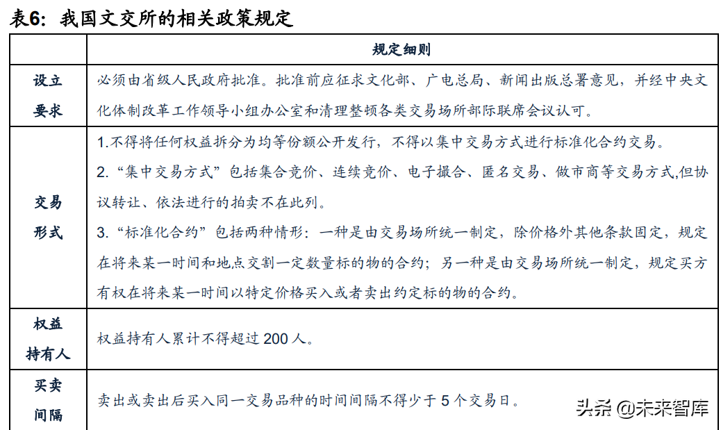 从发展历史看,我国文化交流经历了野蛮生长,进入了比较成熟的发展阶段。因此,中国文化交流的监管机制和运营模式对数字馆藏交易市场具有一定的示范作用。 2009年6月,上海文化财产交易所正式挂牌,成为我国第一家文化交易所。 2010年初,国家九部委发布了《关于金融支持文化产业振兴发展繁荣的指导意见》,明确了文化交流的产业和法律地位。但由于缺乏监管机制,温州交易所鱼龙混杂,平台上出现洗钱、投机等行为。 2011年11月,国务院印发《关于清理整顿各类交易场所切实防范金融风险的决定》。此后,有关部门陆续发文明确了设立条件、交易形式、股东上限、交易区间等。最终,许多文化交流被关闭,行业进入规范运作阶段。