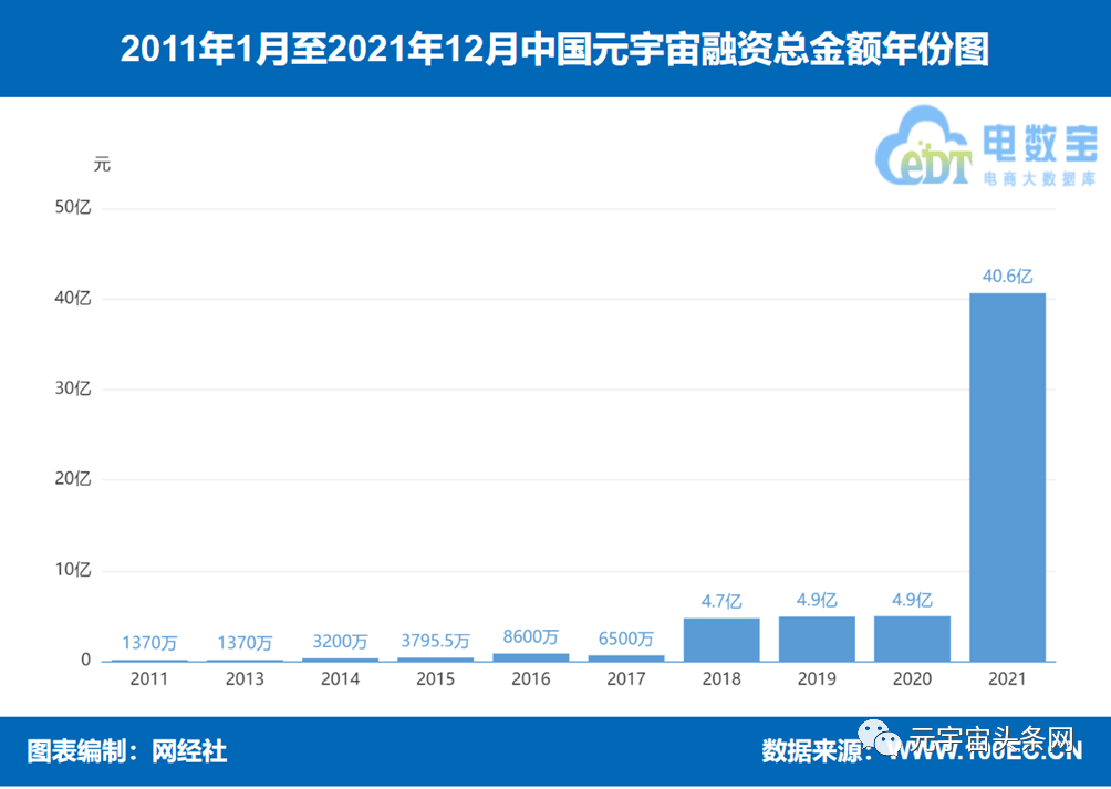 《报告》显示元宇宙,2011年至2021年,中国元界共融资57.7亿元,共融资81次。其中,2011年融资金额约1370万元;2013年融资金额约1370万元;2014年融资金额约3200万元,同比增长133.58%;2015年融资金额约3795.5万元,同比增长18.61%。2016年融资金额约8600万元元宇宙,同比增长126.58%;2017年融资金额约6500万元,同比下降24.42%;2018年融资金额约4.74亿元,同比增长629.23%;2019年融资金额约4.91亿元,同比增长3.59%;2020年融资金额约4.961亿元,同比增长1.02%;2021年融资额约40.63亿元,同比增长719.15%。