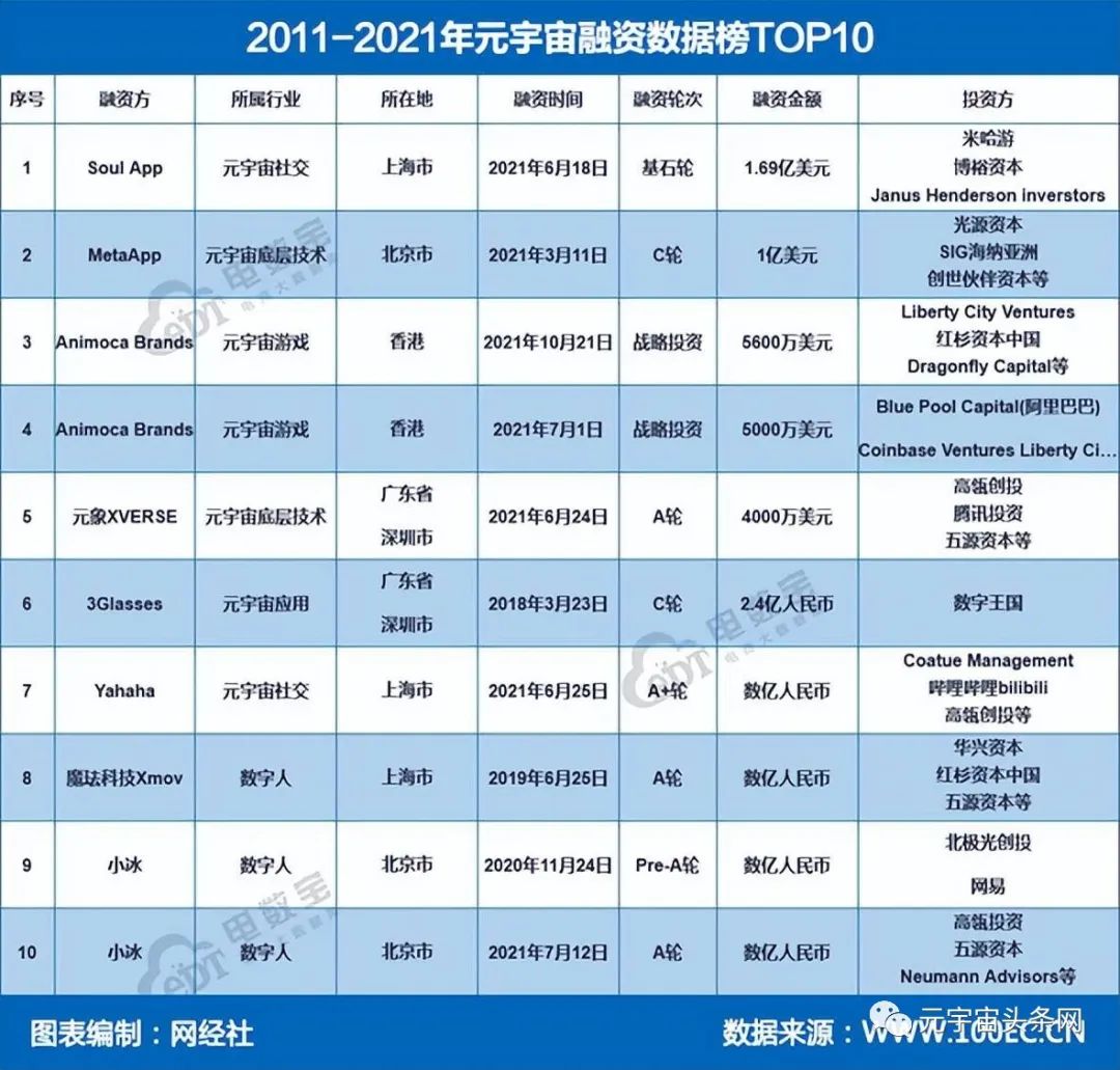在元界2011-2021年的81个融资事件中,融资事件排名前十的分别是Soul App(1.69亿美元)、MetaApp(1亿美元)、Animoca Brands(5600万美元)、Animoca Brands(5000万美元)、元翔XVERSE(4000万美元)、3Glasses(2.4亿元)、Yahaha(亿元)、Xmov(亿元)、小冰(亿元)、小冰(上亿元)万元人民币)。