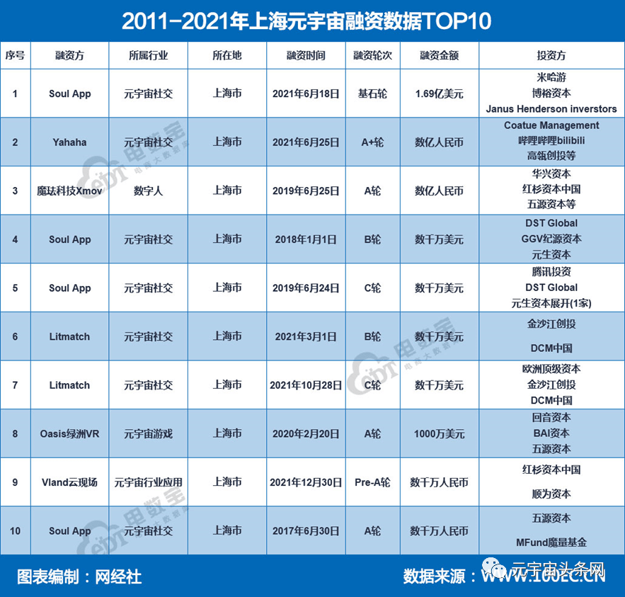 从融资金额来看,上海元界2011-2021年融资金额排名前十的公司分别是:灵魂App1.69亿美元、雅哈哈亿人民币、魔发科技Xmov亿万人民币,灵魂App数千美元,灵魂App千万美元,Litmatch千万美元,Litmatch千万美元,Oasis Oasis VR 1000万美元,Vland云网站千万元,魂App千万元。