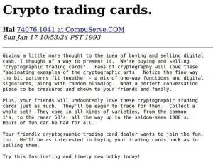 NFT 的前身可以追溯到 1993 年,这是 Hal Finney 在 CompuServe-Crypto Trading Cards 上与 Cypherpunks 小组分享的一个有趣概念。