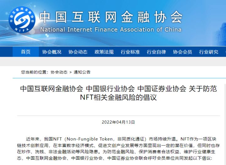 4、2022年4月13日,《关于防范NFT相关金融风险的倡议》提出,NFT行业存在投机、洗钱、非法金融活动等潜在风险。、中国互联网金融协会、中国银行业协会、中国证券业协会。