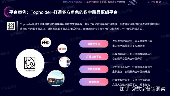 Topholder是一个基于区块链技术的数字馆藏发布和交易平台,已接入微博平台。创作者可以通过微博作品直接链接到自己的数字馆藏,进而发挥数字馆藏的相关价值。Topholder 在平台和用户之间创造了一种新的沟通方式。