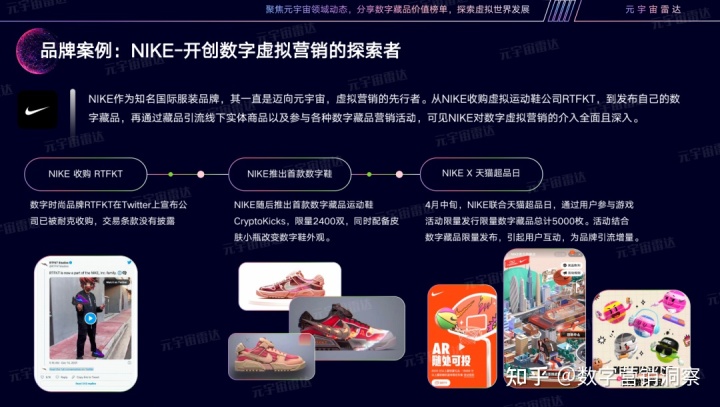 作为国际知名服装品牌,NIKE一直是元界和虚拟营销的先行者。从NIKE收购虚拟球鞋公司RTFKT,到发布自己的数字系列,再到通过系列引流线下实体商品,参与各种数字系列营销活动,可以看出NIKE对数字虚拟营销的介入是全面而深入。