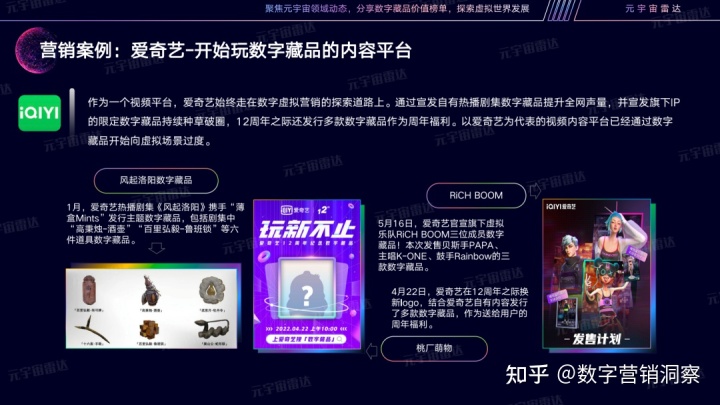 作为视频平台,爱奇艺一直走在数字虚拟营销的探索之路上。通过发布自有热门剧集数字合集,提升全网流量,发布并发布其IP有限数字合集,继续种草破圈。12周年之际,各种数字馆藏作为年度福利发布。以爱奇艺为代表的视频内容平台已经开始通过数字馆藏向虚拟场景过渡。