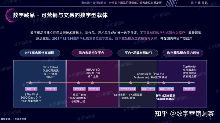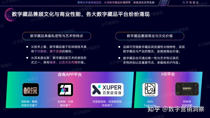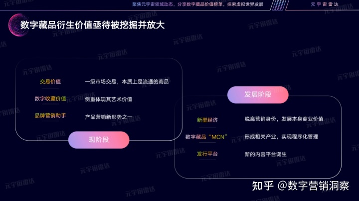 元界雷达从数字馆藏交易平台、主流社交平台、品牌已发布的数字馆藏等角度,全面探索和思考数字馆藏的品牌营销价值,发布了《数字馆藏营销趋势分报告》 ”来分析数字馆藏的概念。在国内的商业影响力。