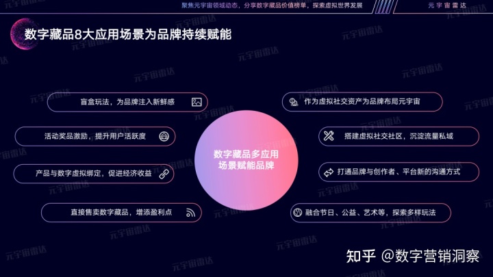 据元界雷达洞察,如今的数字馆藏主要围绕8个应用场景赋能品牌,可以降低品牌进入元界的门槛,从而通过数字馆藏的稀缺性刺激用户交流,带动产品销量增长。