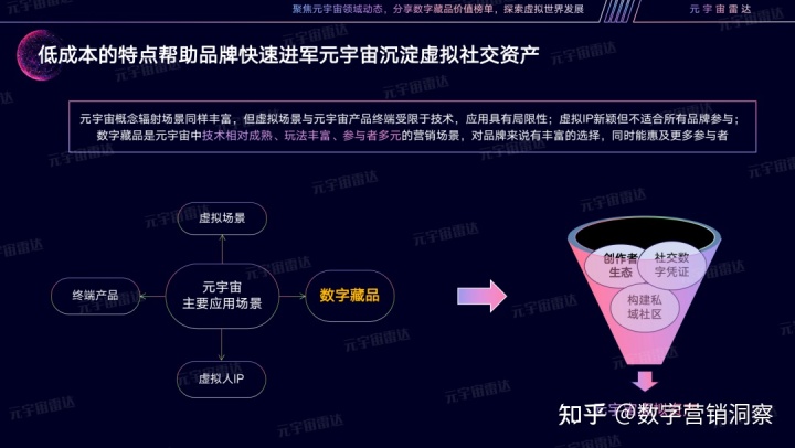 元界概念辐射场景也很丰富,但虚拟场景和元界产品终端受限于技术,应用受限。虚拟IP虽然新颖,但并不适合所有品牌参与。数字馆藏是元界中技术相对成熟、覆盖面广的营销工具,为品牌提供了丰富的选择,同时可以惠及更多的参与者。
