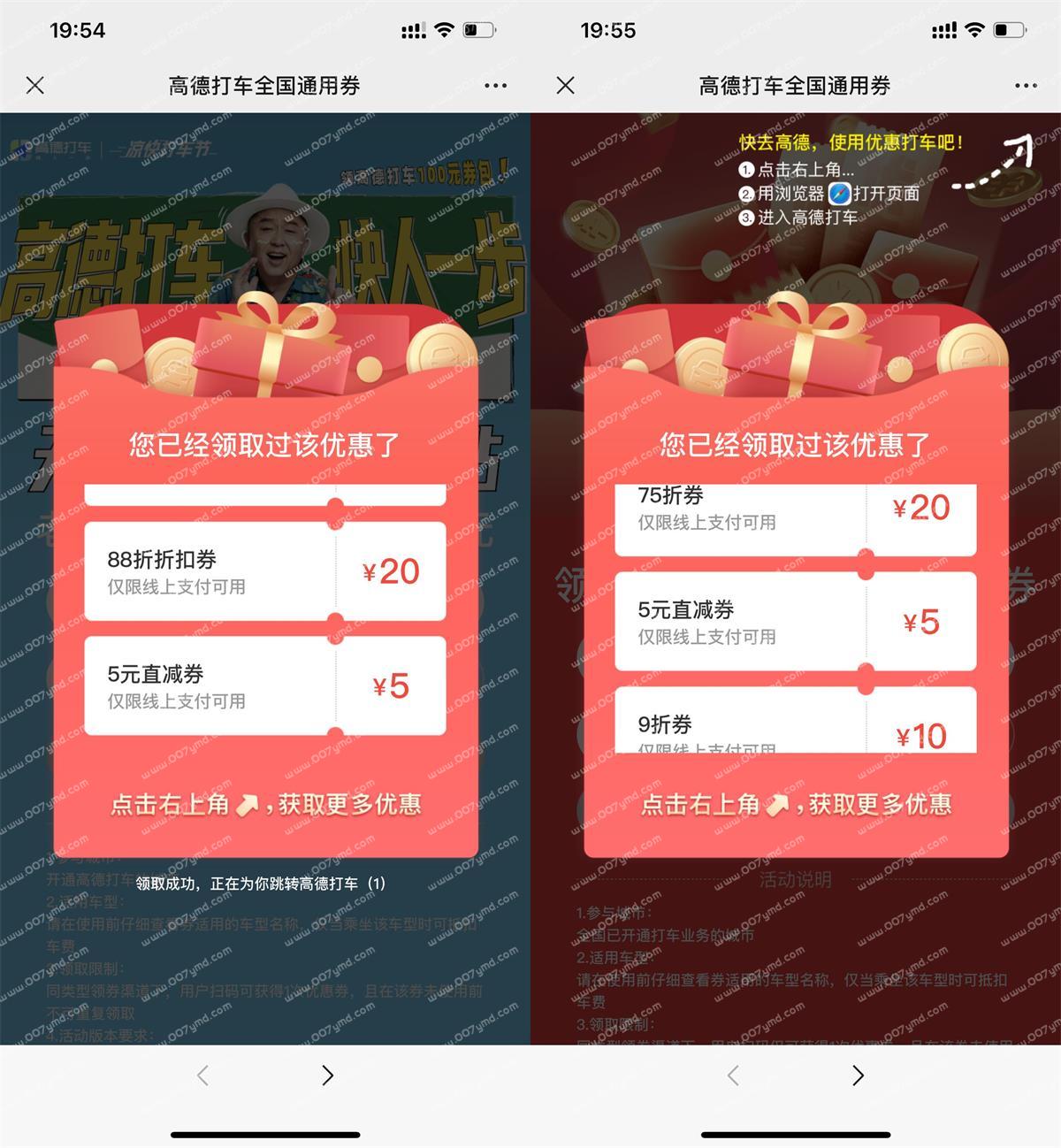高德打车领取2张5元无门槛券