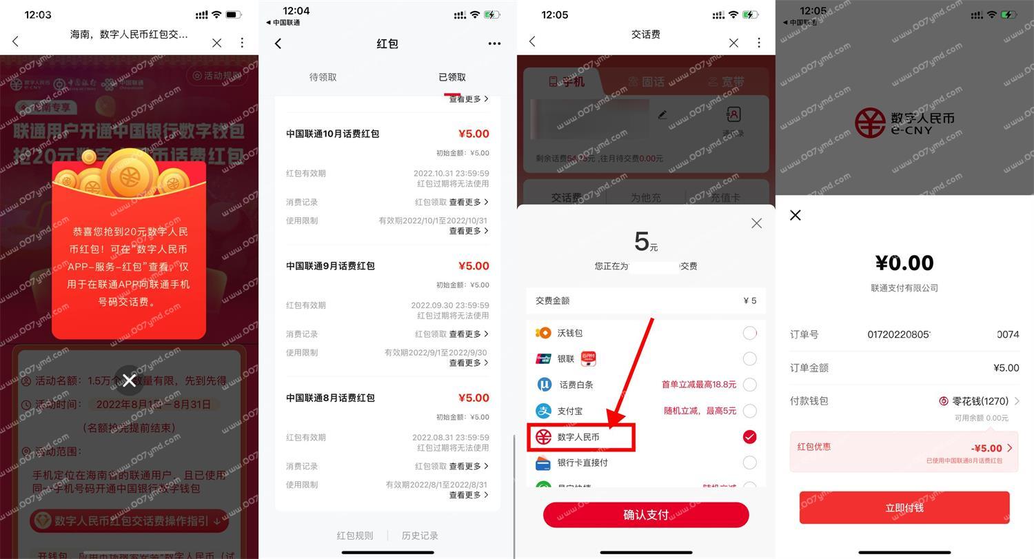 2、每个红包分成4个5元->充话费使用数字人民币无门槛抵扣