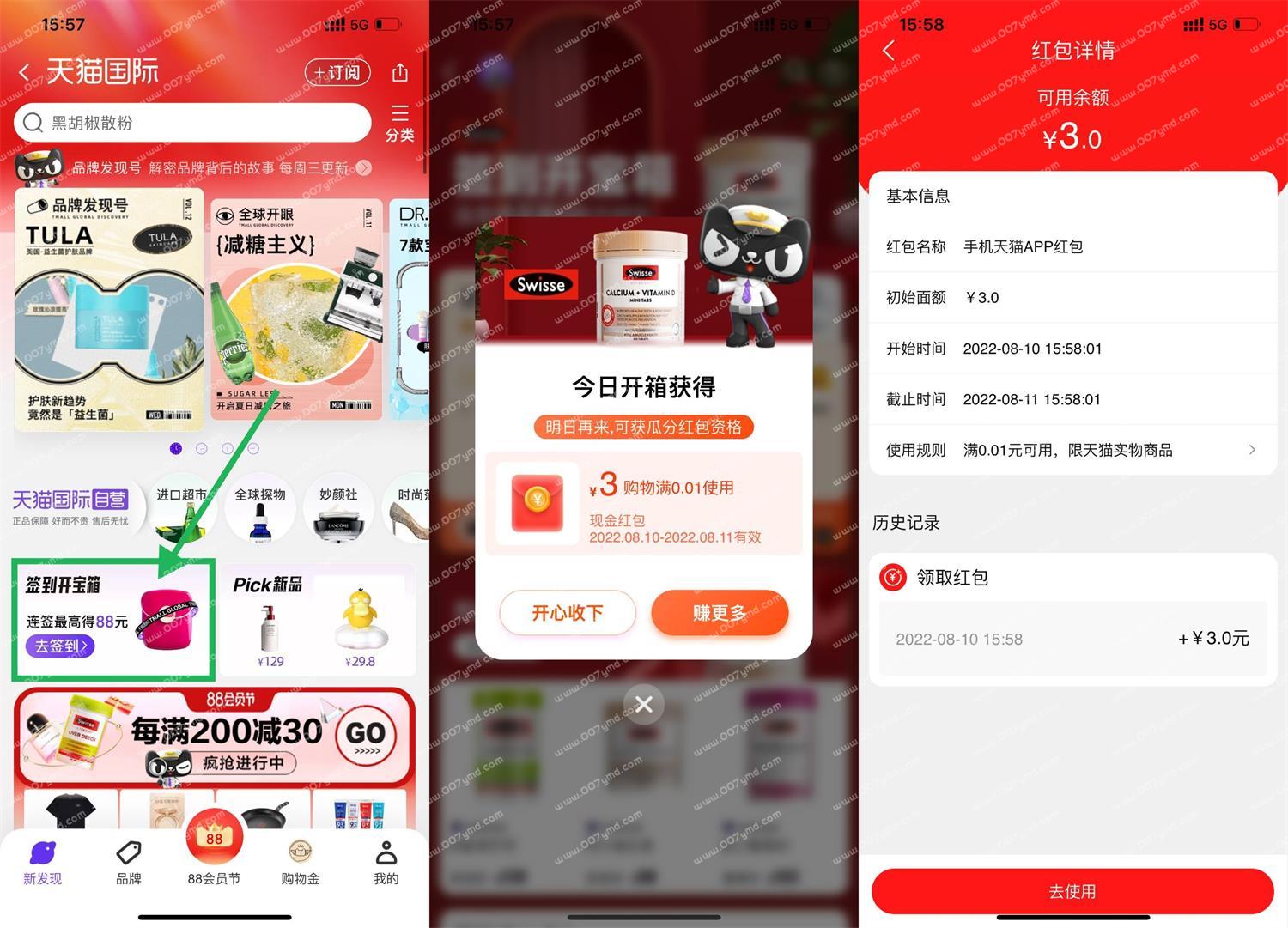 淘宝首页“天猫国际”进入->签到开宝箱->基本必中3元天猫红包(不中换号试试)->红包在“天猫APP”购物无门槛抵扣