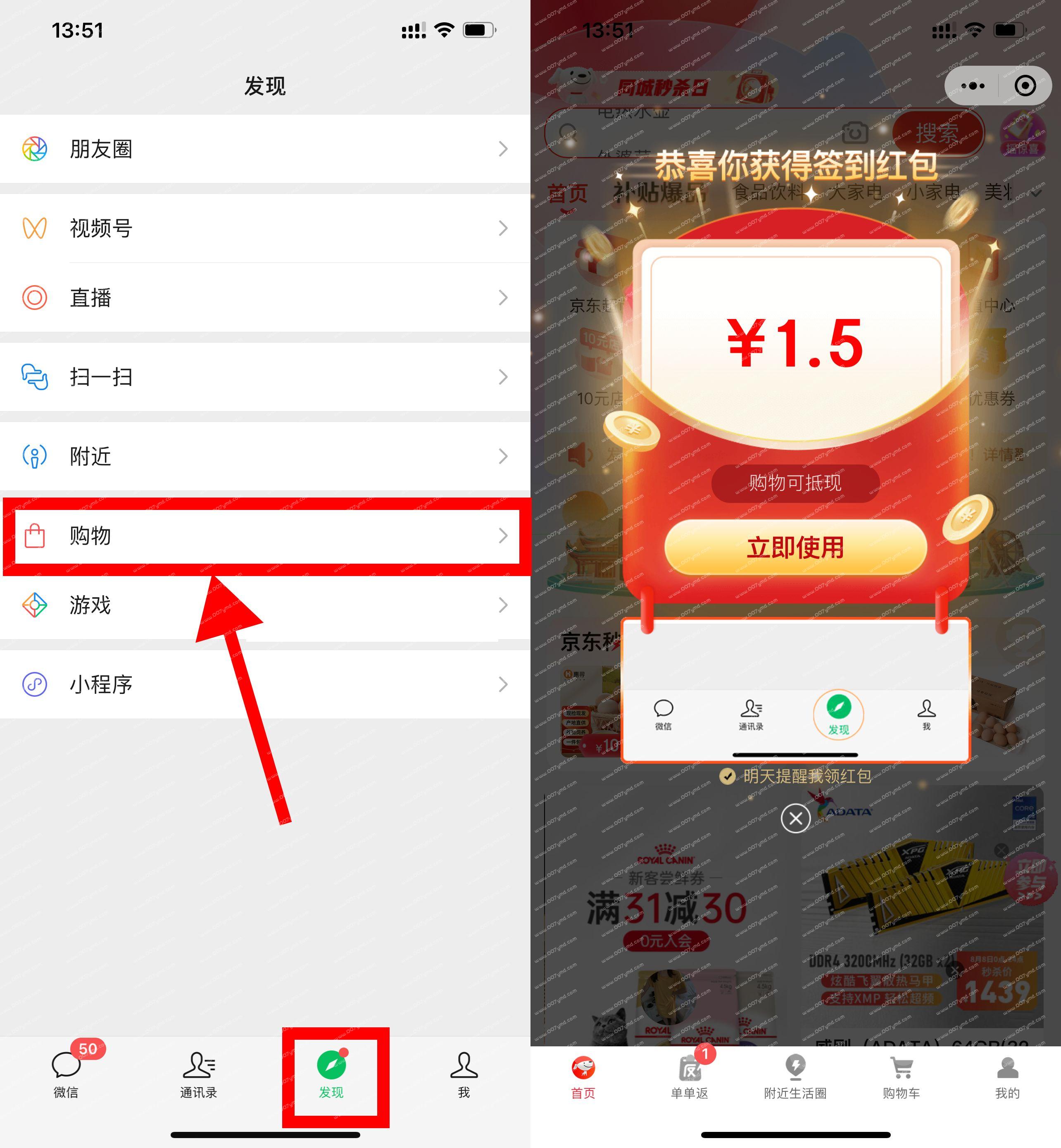 微信APP->底部“发现”->进入“购物”->自动弹出签到红包