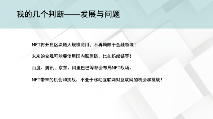 上图是作者在2021年3月写的PPT中的两页。巧合的是,作者可能是第一个看到NFT在中国蕴含的巨大机会,并认为它的未来可能是几十个市场数十亿或数千亿。并且当时笔者提出未来合规可能要使用国内的联盟链。