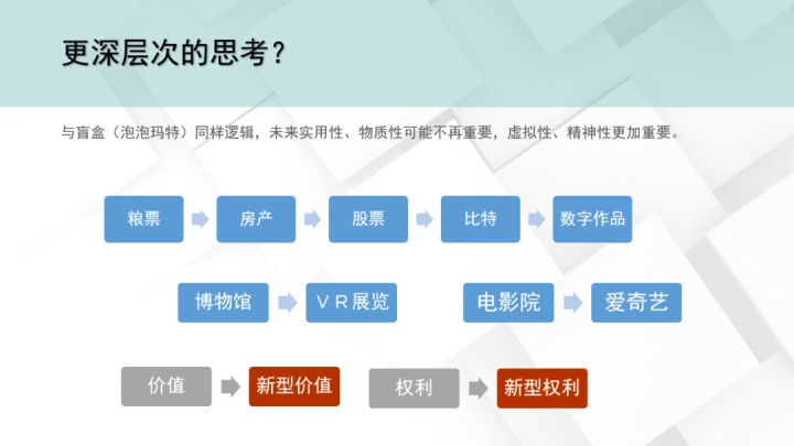 NFT 实际上与盲盒和 IP 衍生品非常相似。盲盒在中国的年市场规模已达到 60 到 700 亿只。盲盒有什么用,不能吃,不能穿,不能用,但是很多人会买。物质性和实用性不再重要。未来,乐趣、虚拟和灵性可能比物质更重要。