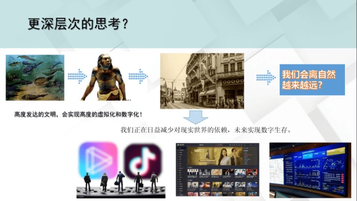 我也有一个观点,人类会越来越远离自然。高度发达的文明将实现高度的虚拟化和数字化!我们对现实世界的依赖越来越少,未来数字化的存在是可能的。