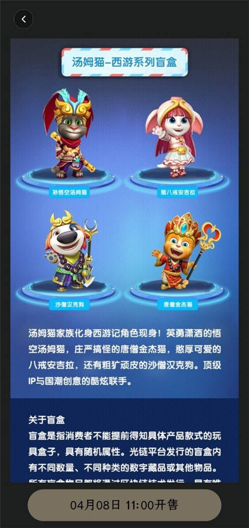 Lightchain平台的正式上线数字藏品,为广大数字收藏爱好者带来了汤姆猫家族IP限量发行的热门人物数字合集数字藏品,包括《超级英雄汤姆猫》、《休闲装安吉拉》、《休闲装》《狗本》 《汤姆猫西游系列盲盒》是汤姆猫家族IP系列移动应用产品中的超人气角色。