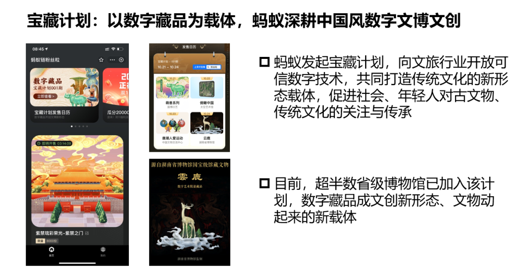 现在,蚂蚁、腾讯、百度等互联网巨头纷纷推出相关业务。以蚂蚁集团为例,“宝藏计划”启动以来,已有17家博物馆加入并陆续发行数字馆藏,蚂蚁链为其提供了技术支持。